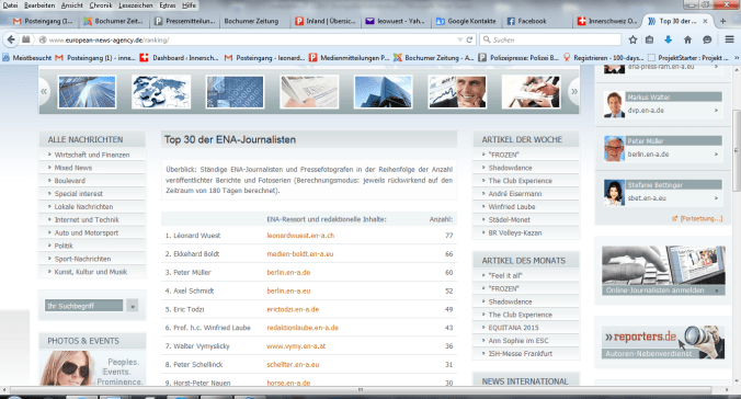 Ich bin einer von über 200 Redaktoren (davon nur 10 Schweizer) bei der ENA (European News Agency) european-news-agency.de/und liege seit acht Jahren in den Top five der neutralen Rankingliste der ENA Weiterlesen